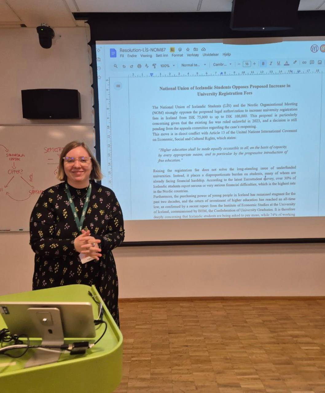 Einnig lagði LÍS fram ályktun um verndun réttinda nemenda utan EES ásamt öðrum stúdentafélögum á Norðurlöndunum og í Eystrasaltsríkjunum, en ályktunina má lesa hér: Resolution on protecting non-EU/EEA international students’ rights in Northern Europe - European Students' Union. Að lokum lagði LÍS, ásamt öðrum stúdentafélögum, fram ályktun um aðgengi palestínskra nemenda að námi, en ályktunina má lesa í heild sinni hér: Easing visa-based access to studies abroad for Palestinian students - European Students' Union. Fulltúar LÍS eru ánægðir með framvindu stjórnarfundarins, en fundirnir eru mikilvægur liður í starfi ESU og til tengslamyndunar við aðrar stúdentahreyfingar.