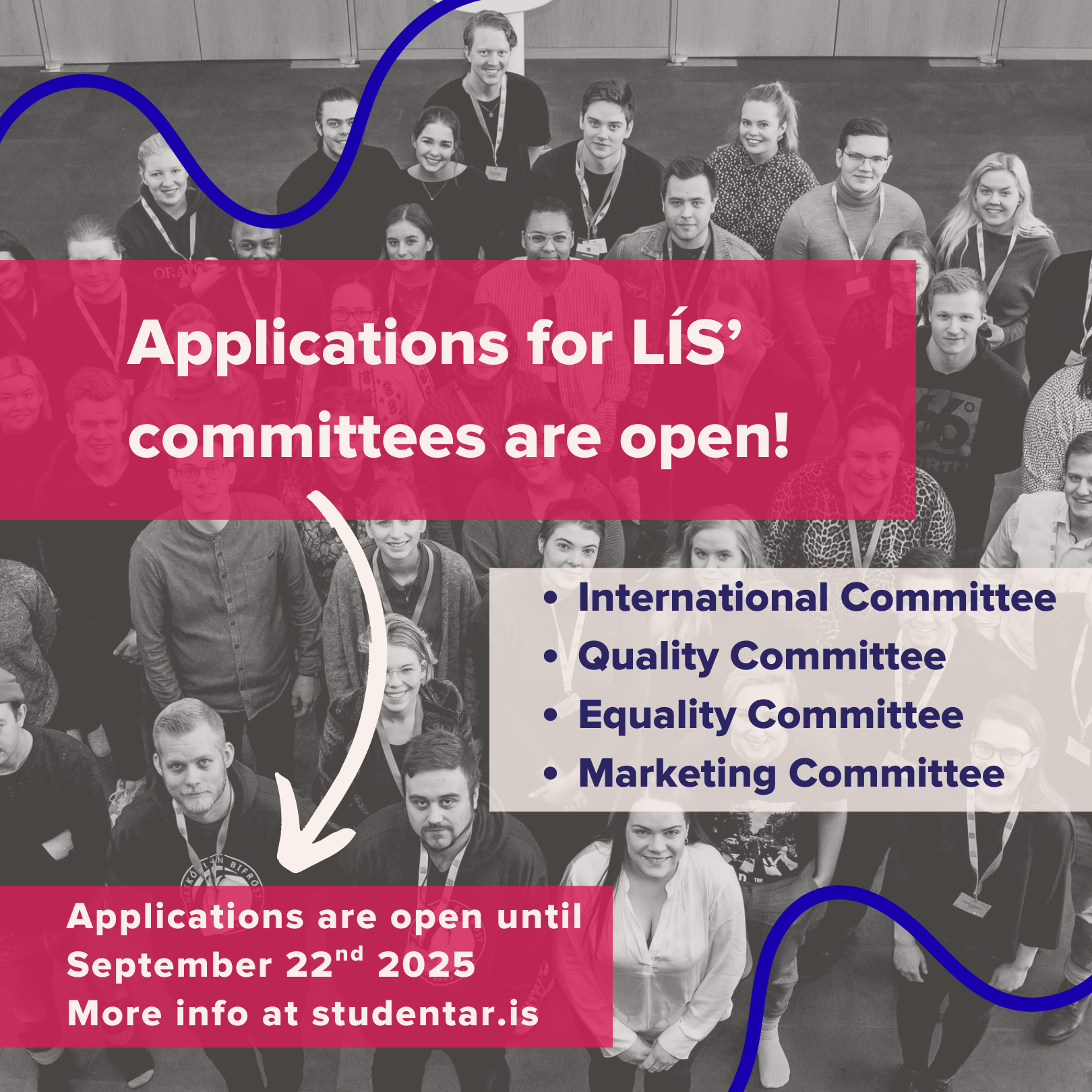 Do you want to make an impact and take part in advocating for the interests of Icelandic university students? The National Union of Icelandic Students (LÍS) has available seats in four of its committees: Quality Assurance Committee, Equal Rights Committee, International Committee and the Marketing Committee. Applications are open until September 22nd. Please let us know which committee you are interested in, your full name, education, experience of social activities and/or other relevant experience and a few sentences describing your motivation for applying. We encourage individuals of any gender to apply for the available positions.