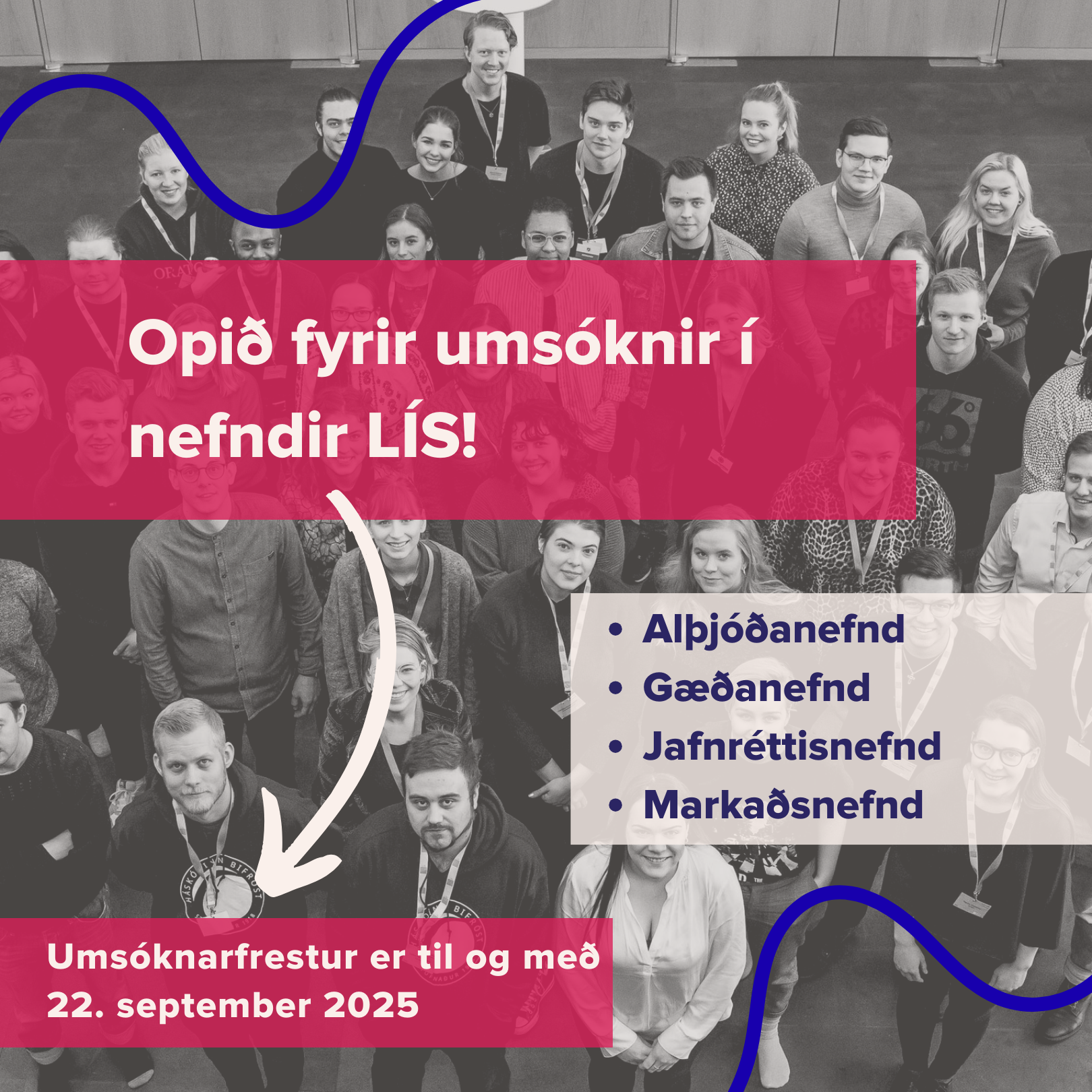 Langar þig til þess að hafa áhrif og vera með í hagsmunabaráttu stúdenta á landsvísu? Landssamtök íslenskra stúdenta (LÍS) auglýsa eftir áhugasöm einstaklingum í gæðanefnd, alþjóðanefnd, jafnréttisnefnd og markaðsnefnd. Opið er fyrir umsóknir til 22. September 2025. Í umsókn skal koma fram: Hvaða nefnd þú sækir um í, nafn, menntun, reynsla af félagsstörfum og/eða önnur reynsla sem gæti nýst og stutt lýsing á ástæðu umsóknar. Við hvetjum einstaklinga af öllum kynjum til að sækja um. Umsóknir berast á lis@studentar.is.
